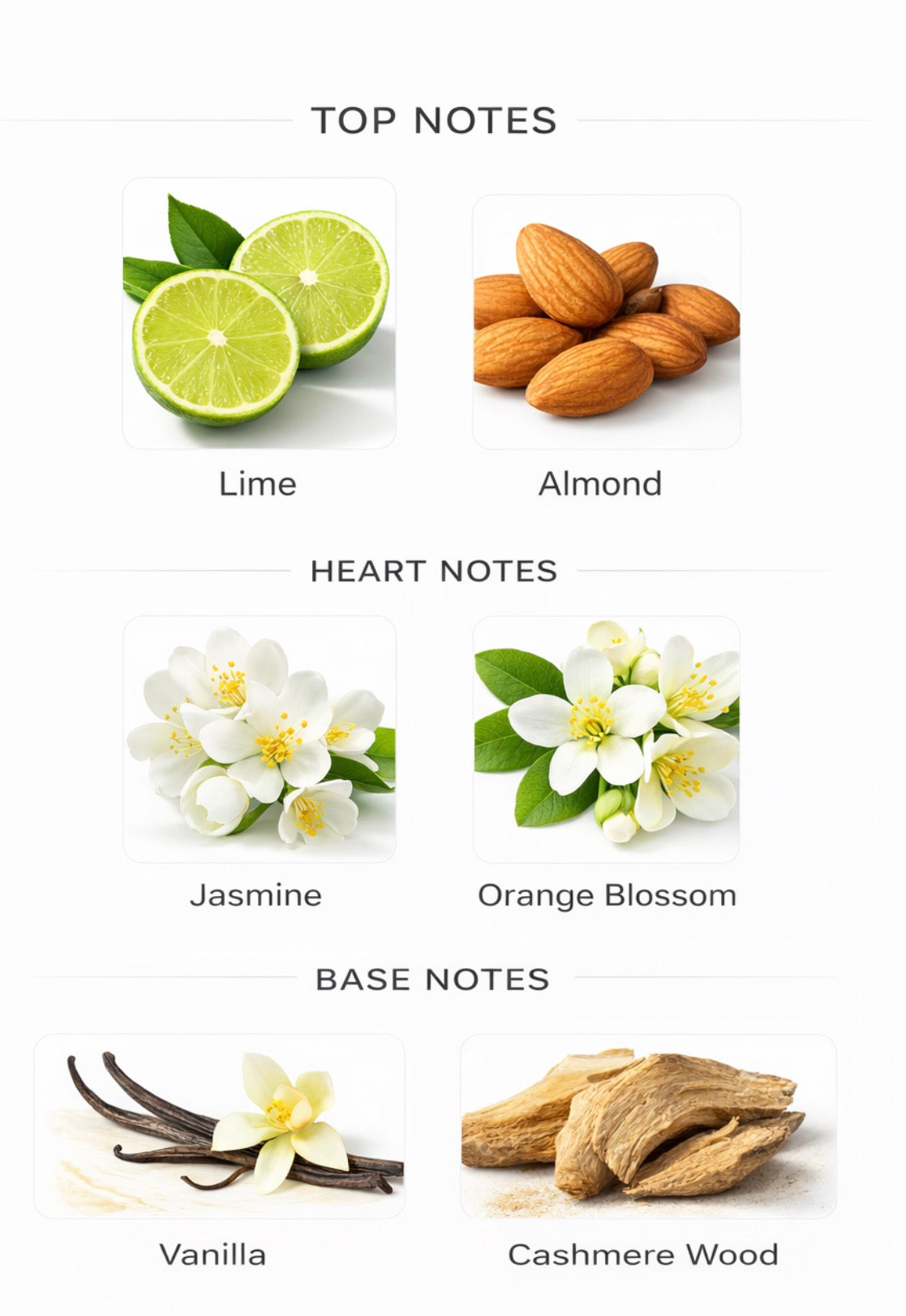 The base is warm and enveloping. Vanilla adds a creamy sweetness that feels indulgent but not heavy, while cashmere wood provides a soft, musky-woody texture that lingers gently on the skin.
